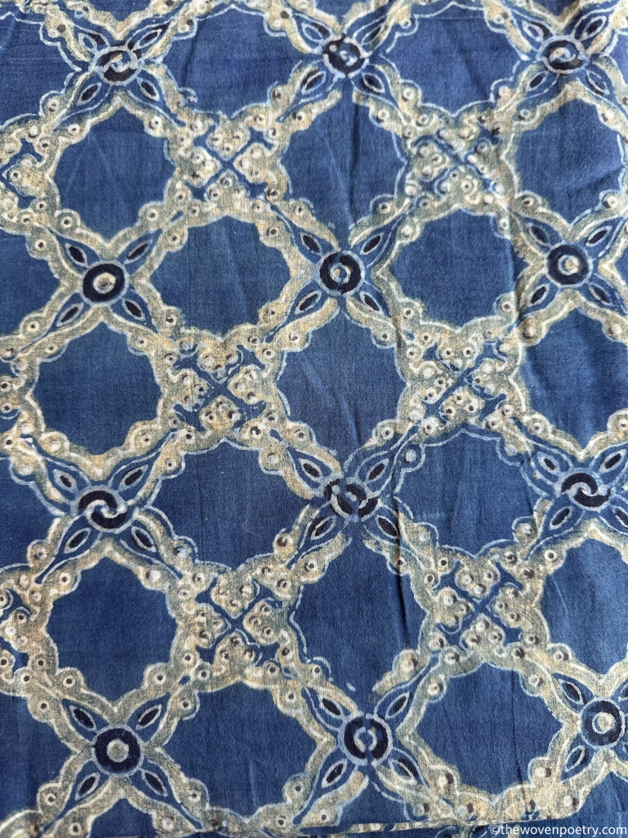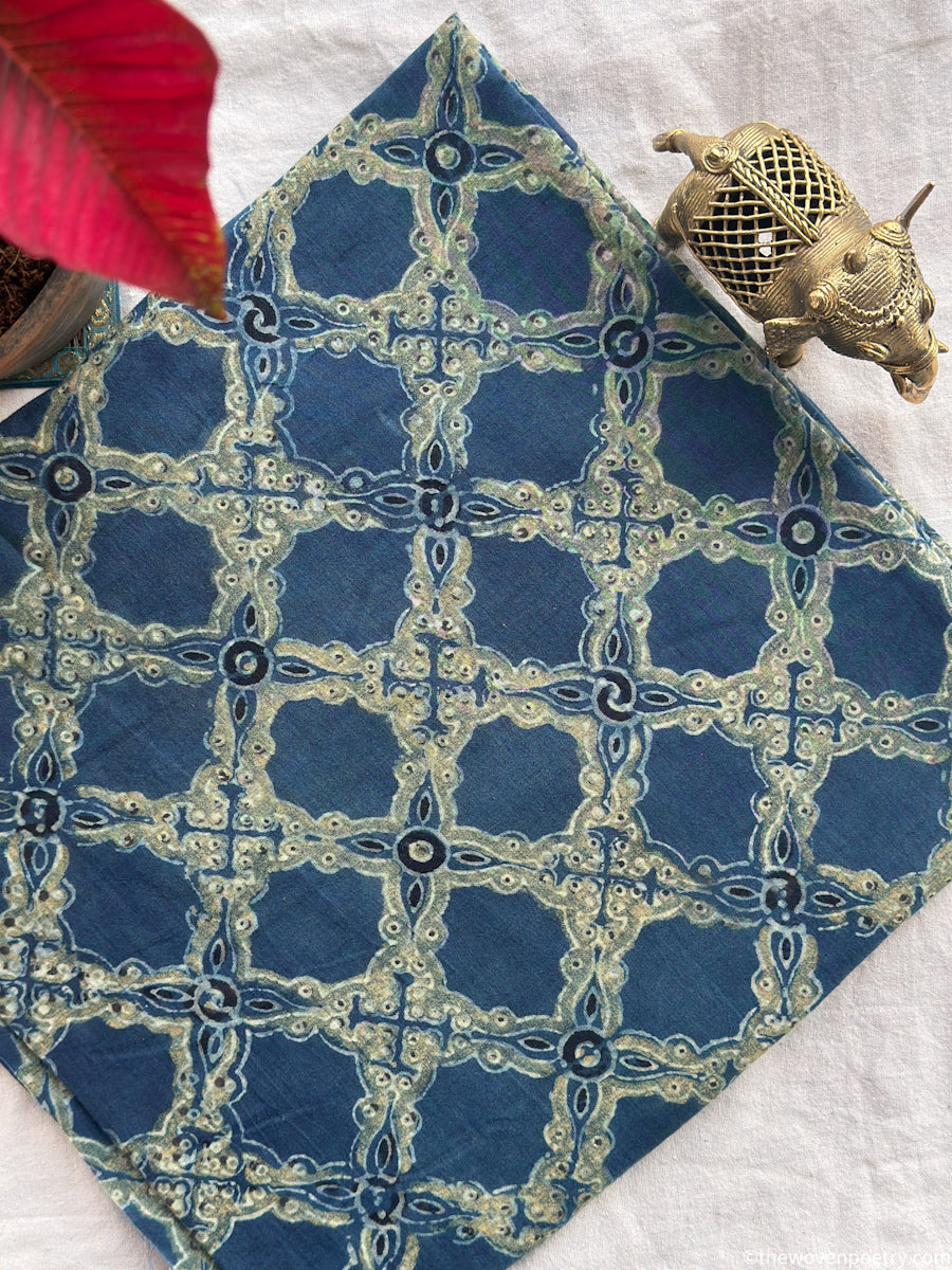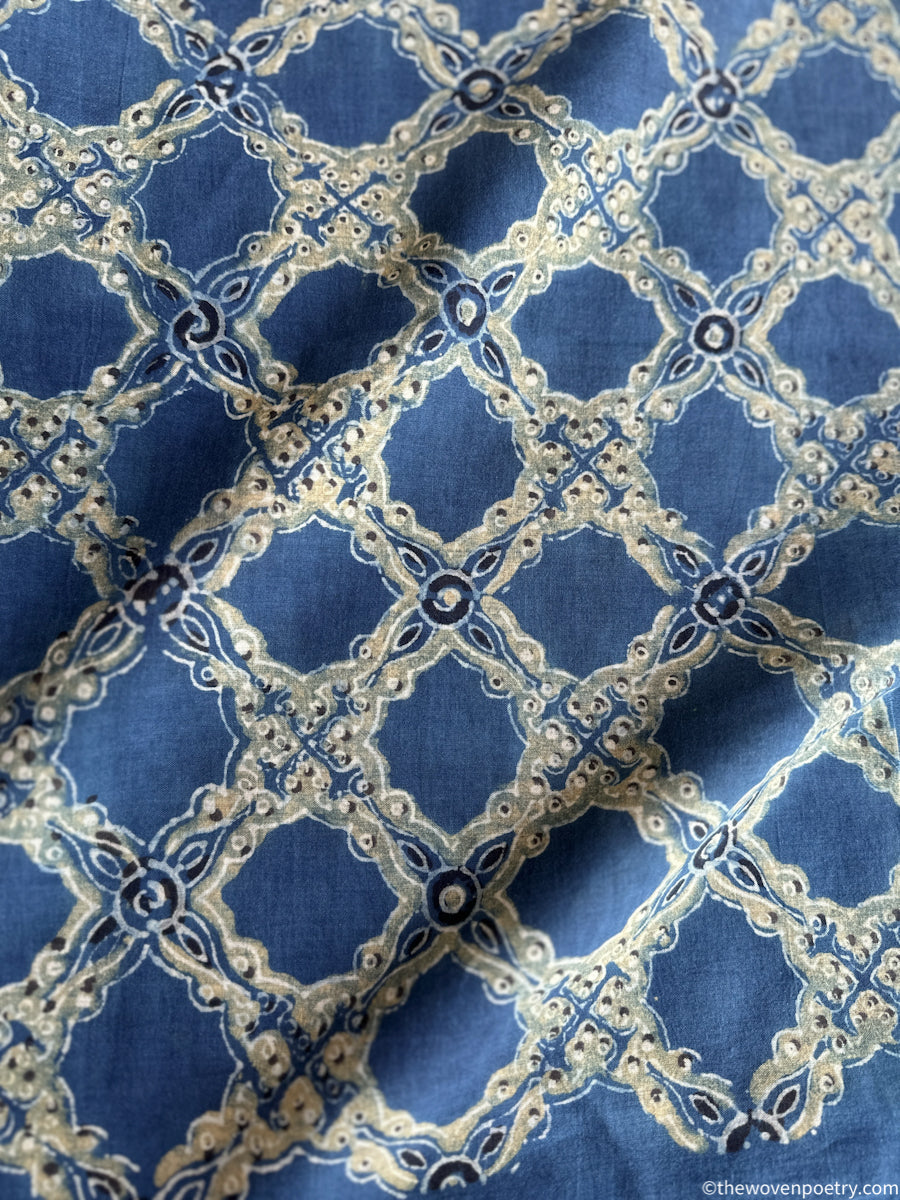 A handcrafted Ajrakh cotton fabric by Woven Poetry, created using traditional hand block printing techniques rooted in India’s Ajrakh textile tradition. Known for its distinctive geometry, deep natural colours, and symmetrical layouts, this 2.5 metre fabric is ideal for creating kurtas, dresses, kaftans, coord sets and statement garments.