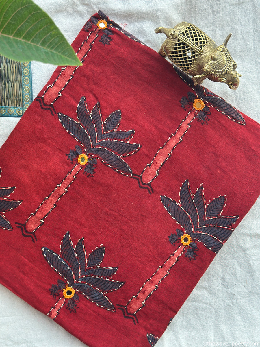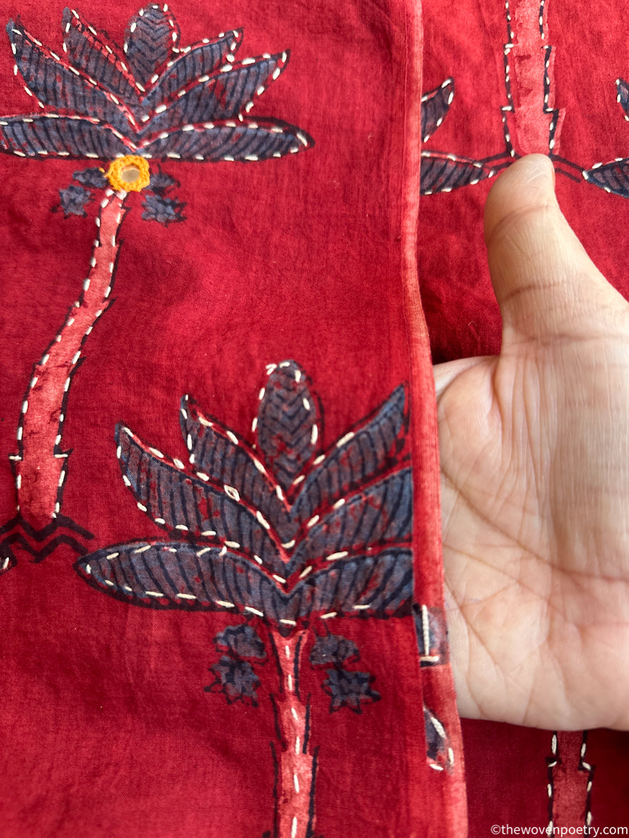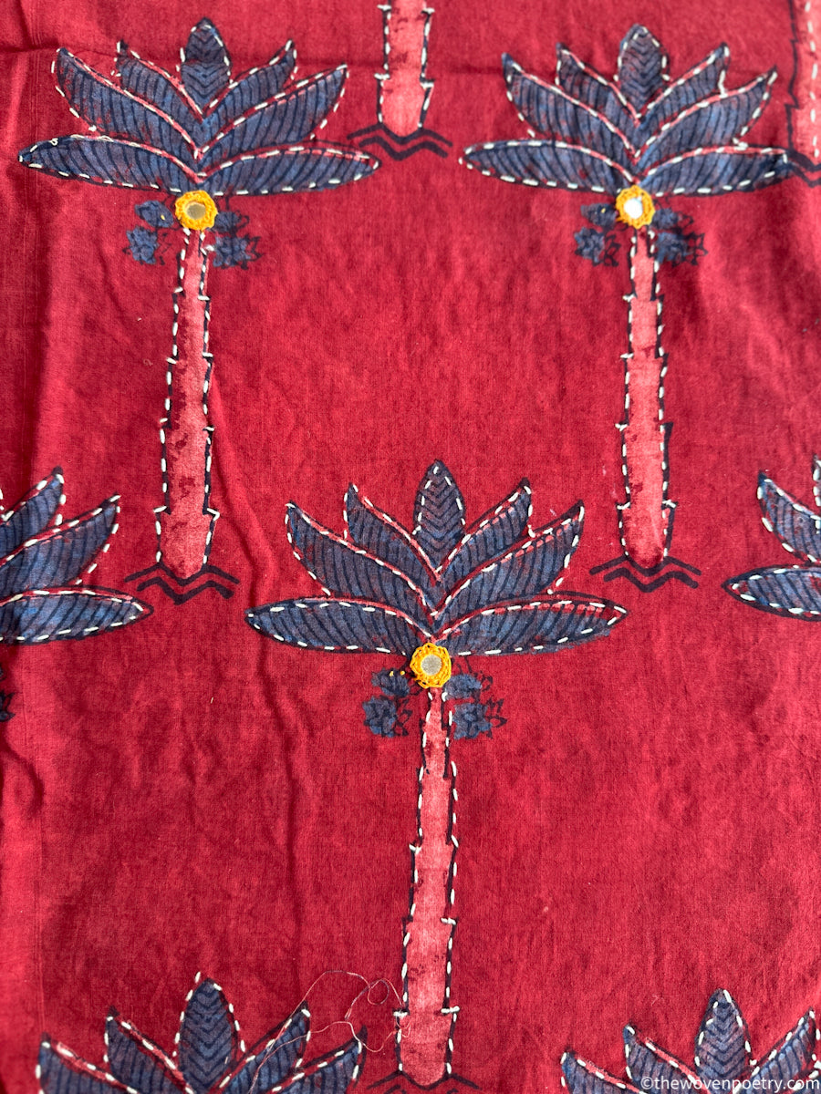A handcrafted Ajrakh cotton ready length fabric by Woven Poetry, featuring traditional hand block printing with fine embroidery and mirror detailing. Indigo and Red-toned Ajrakh with organic motifs. Known for its distinctive geometry, deep natural colours, and symmetrical layouts, this 2.5 metre fabric is ideal for creating kurtas, dresses, kaftans, coord sets and statement garments.