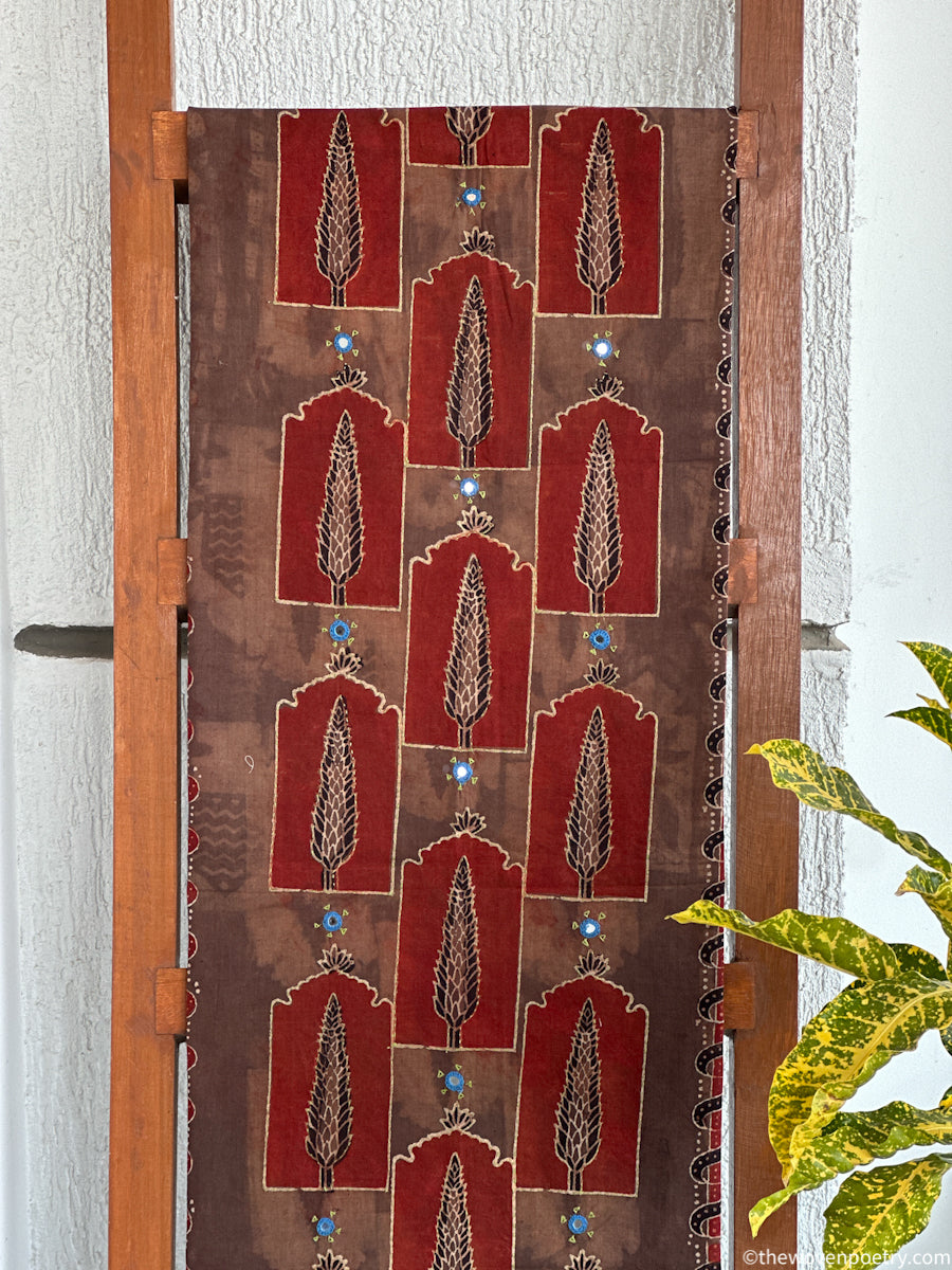 This Ajrakh cotton ready length fabric by Woven Poetry is crafted using traditional resist-dye techniques and enriched with hand embroidery and mirror work. The intricate motifs and earthy tones reflect slow, thoughtful craftsmanship, making it perfect for elegant kurtas, tunics, and contemporary ethnic silhouettes.
