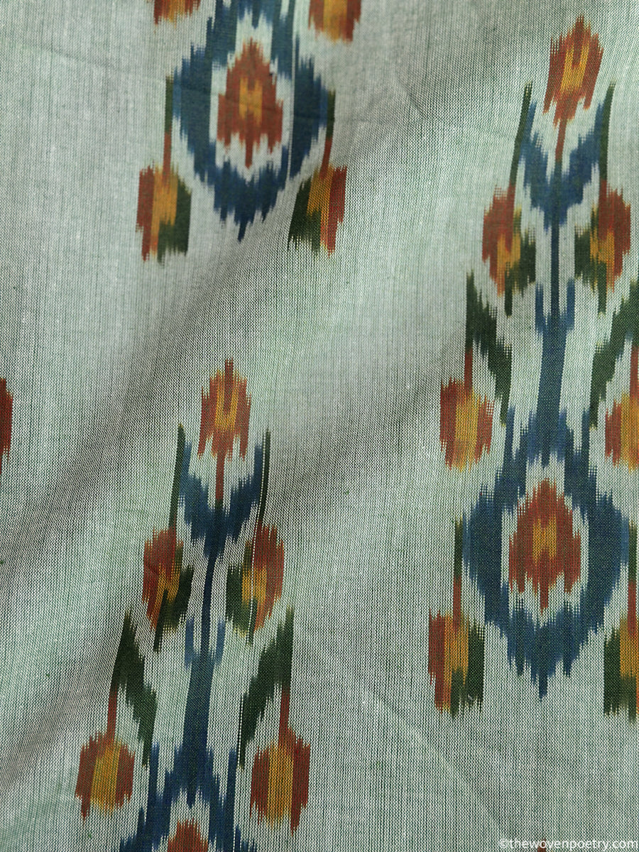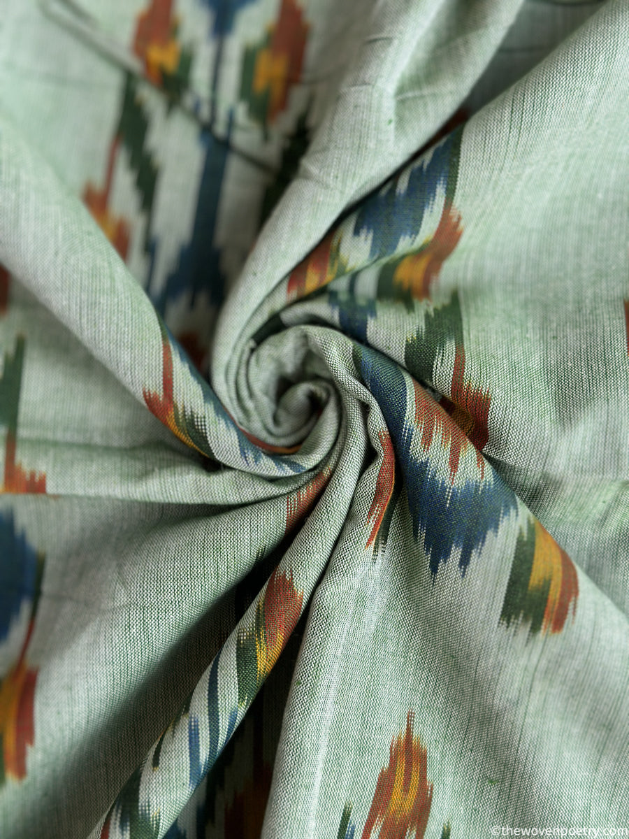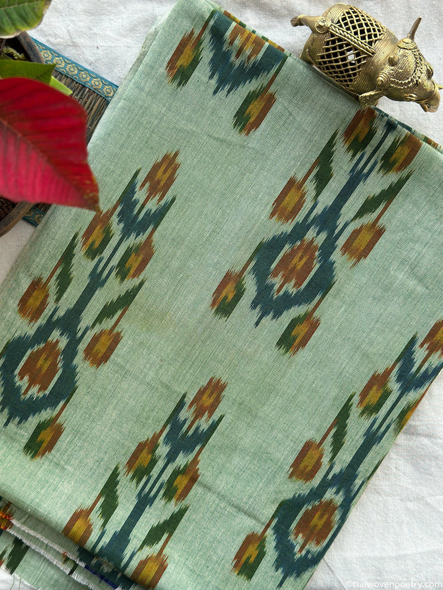 Handwoven using the traditional single ikat technique, the yarns are resist-dyed before weaving to create precise, symmetrical motifs that are distinctive to Pochampally textiles. The natural texture and subtle irregularities reflect the authenticity of handloom weaving, making each piece unique.