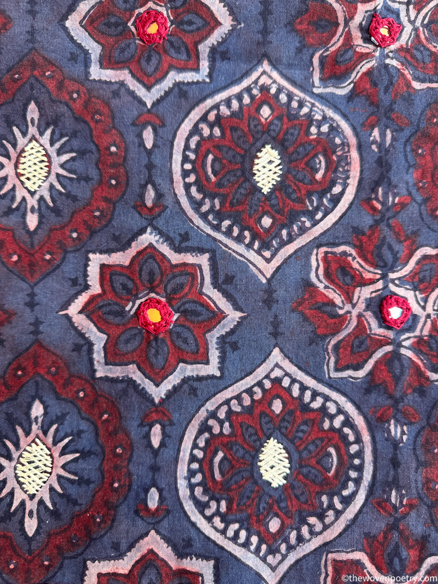 This Woven Poetry fabric blends floral influences with traditional Ajrakh artistry. The indigo base is softened by organic motifs and subtle hand embroidery, making it ideal for graceful silhouettes.