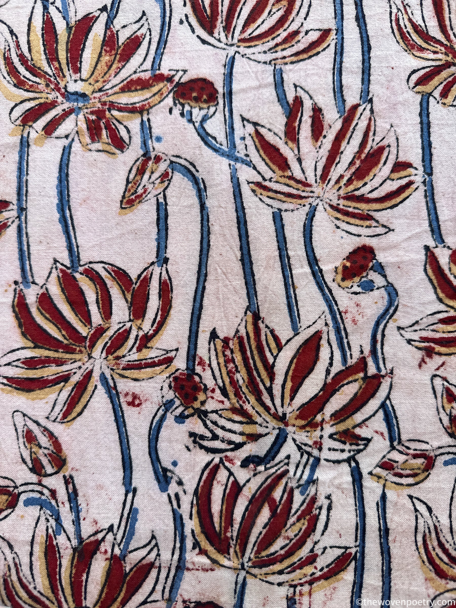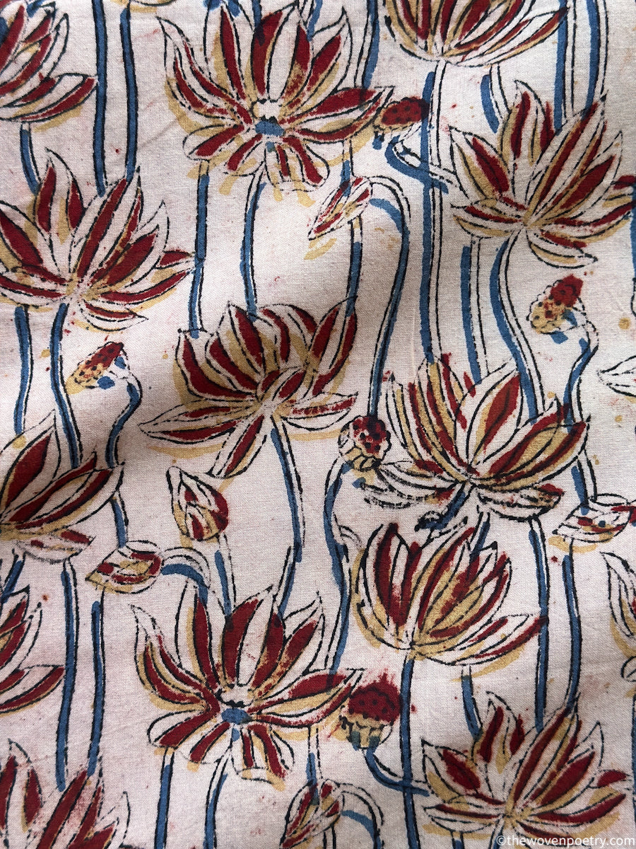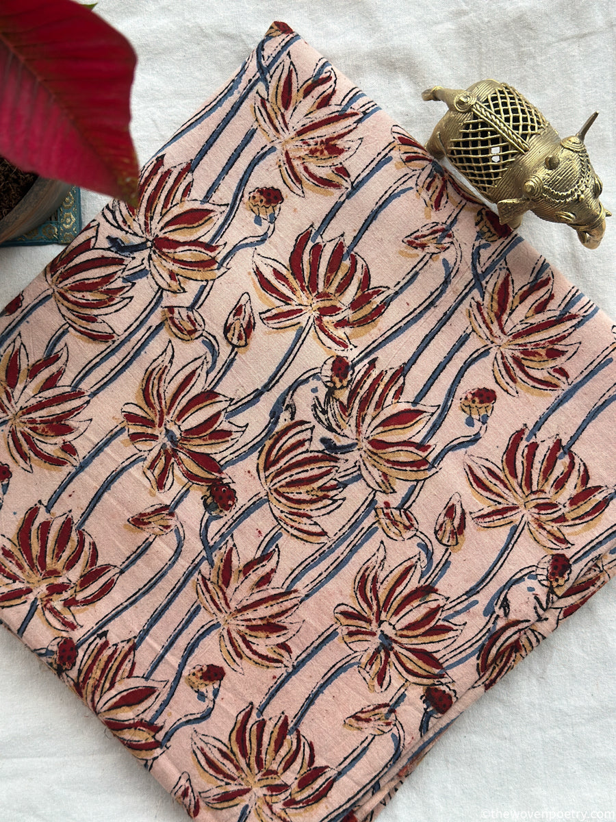 A handcrafted Kalamkari cotton fabric by Woven Poetry, created using traditional hand block printing techniques from Machilipatnam, Andhra Pradesh. Machilipatnam Kalamkari is a Geographical Indication (GI) tagged craft of India, celebrated for its intricate motifs, storytelling patterns, and natural dye processes. This 2.5-metre ready-length fabric is ideal for kurtas, dresses, kaftans, coord sets, blouses, and creative garment projects