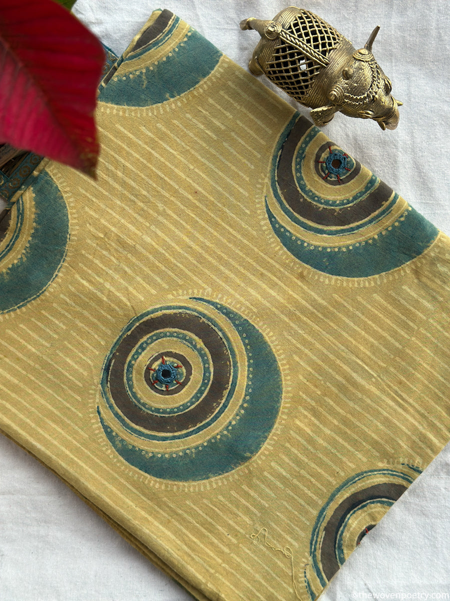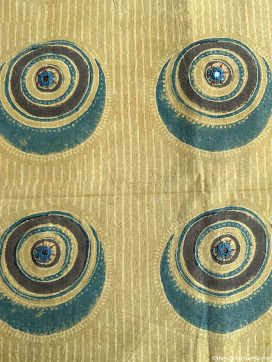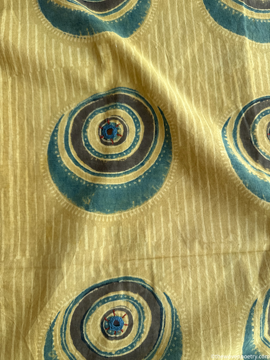 Soft mustard tones combined with traditional Ajrakh motifs create a warm, understated fabric. Subtle embroidery adds texture without overpowering the design.