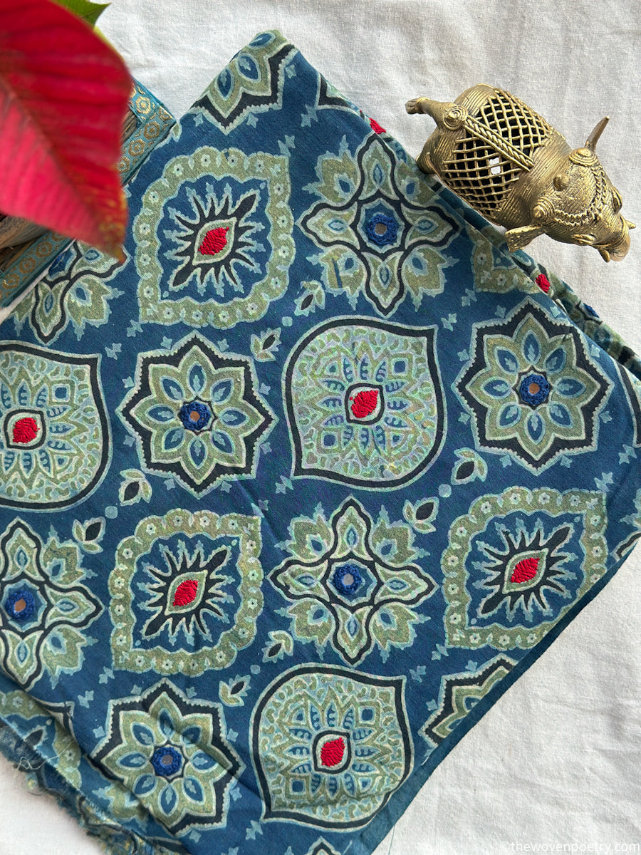 A celebration of classic indigo, this Ajrakh fabric by Woven Poetry features rhythmic patterns inspired by traditional geometry. The hand embroidery adds a tactile richness, making it a versatile fabric for both casual and statement wear.