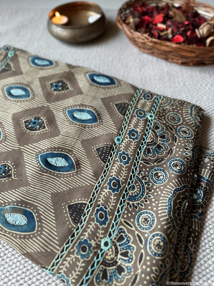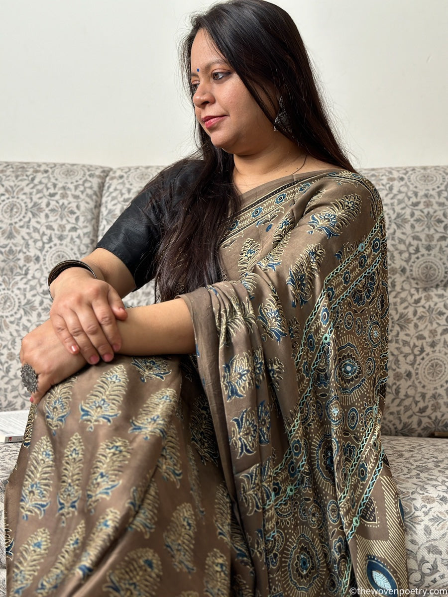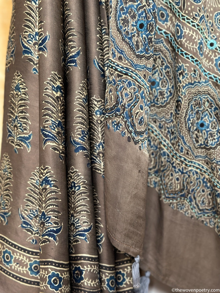 Elevate your style with our premium Modal Silk Saree, a stunning fusion of heritage and elegance. Adorned with intricate Ajrakh Handblock Prints and enhanced with delicate hand embroidery and mirror work, this saree embodies timeless artistry. The soft, luxurious fabric drapes gracefully, making it perfect for festive occasions, celebrations, and special moments.